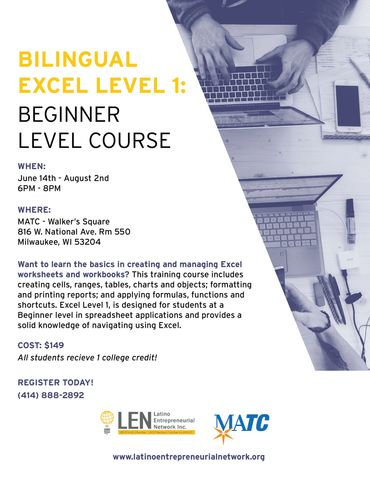 Register now for our upcoming Excel Beginner's Course through MATC (Bilingual Course). Includes textbooks and students will receive 1 college credit upon completion of course.