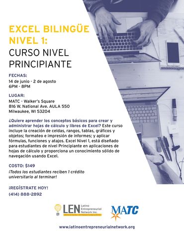 Registrese ahora para nuestro próximo Curso de Excel para principiantes a través de MATC (Curso Bilingüe). Incluye libros de texto y recibirá 1 crédito universitario al terminar el curso.